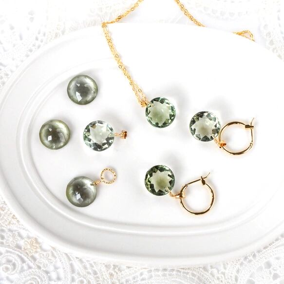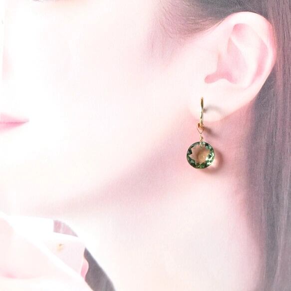 14kgf大粒グリーンアメジストラウンドファセットカットフープピアス"