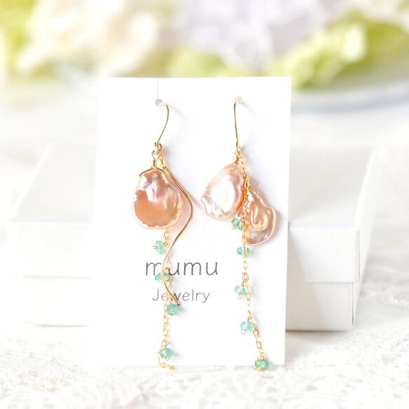 14kgf/花びらパールとエメラルドのウェーブチャームアシンメトリーピアス