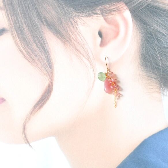 桜色のグァバクォーツ、新緑を思わせるツァボライト、甘やかなストロベリークォーツの組み合わせが、春の訪れを感じさせる美しい彩りで制作したピアスです。